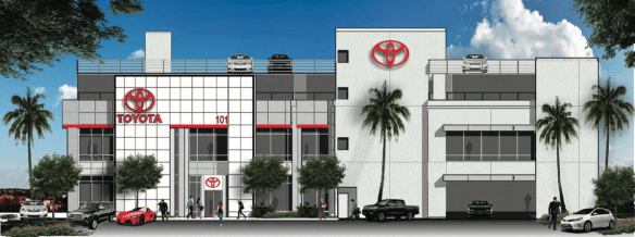 Contrast their existing one-story sales building, above, with the rendering of the proposed building that Toyota 101 supplied as part of their proposal: