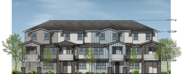 Enough with the dead and frozen projects: there are some interesting new and advancing ones as well. One that has actually been on the list for a while now, but got the thumbs-up from Redwood City’s Planning Commission, is the 17-unit project proposed for a handful of lots on and near the corner of Harrison Avenue and Cleveland Street. The so-called California Communities – Harrison Ave project would be right across Harrison Avenue from the McKinley Institute of Technology/North Star Academy campus, and would replace seven aging single-family homes and one accessory dwelling unit on seven separate parcels (433-467 Harrison Ave., plus 515 Cleveland St.) with seventeen three-story townhouses. Each for-sale townhouse would have a two-car garage on the ground floor, topped by two levels of living space. Most of the townhouses would have three bedrooms, although four of them—the ones that would face onto Cleveland Street—would have four bedrooms each.