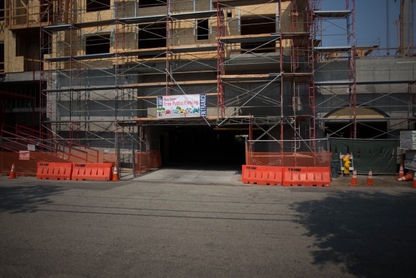 In the above picture, the retail spaces that will face San Carlos Avenue are along the right-hand wall. Each retail space will have a door that opens into this tunnel, although I don’t yet know whether these doors will be for use by the public, or if they will merely be back doors through which the shop employees take in stock, haul trash, and the like. Walnut Street is straight ahead, and the garage is behind the left-hand wall.