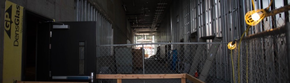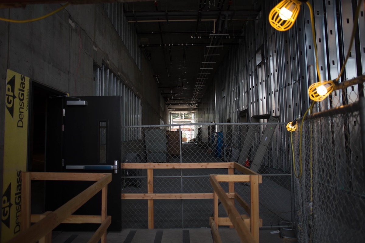 In the above picture, the retail spaces that will face San Carlos Avenue are along the right-hand wall. Each retail space will have a door that opens into this tunnel, although I don’t yet know whether these doors will be for use by the public, or if they will merely be back doors through which the shop employees take in stock, haul trash, and the like. Walnut Street is straight ahead, and the garage is behind the left-hand wall.