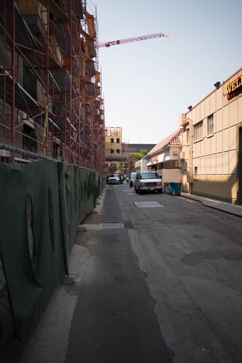 That protruding part of the building is also still under construction; don’t expect the San Carlos Avenue end of the alley to be opened until the Wheeler Plaza building is complete.