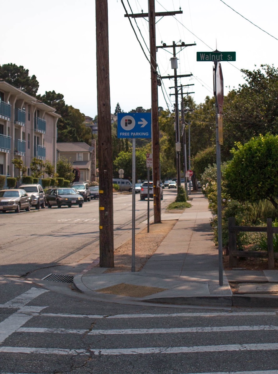 I walked the entire block just to make sure I wasn’t missing anything, and I was glad I did: San Carlos has already put up a couple of signs directing motorists to the new garage. For instance, this one stands at the corner of Walnut and Cherry: