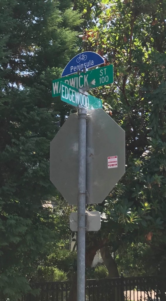 Cordilleras Creek serves as the boundary between Redwood City and San Carlos, and currently is the northern end of the Peninsula Bikeway. There isn’t yet a permanent sign marking the start of the bikeway, but head south on Warwick and you’ll see one between Edgewood Road and Arlington Road. Along the bikeway watch for signs with a blue “topper”: a dome-shaped blue sign with the image of a bike and the words “Peninsula Bikeway” (or just “Peninsula”) on top. They’re placed above official bikeway signs of course, but also atop many regular street signs, assuring the rider that they are on the correct route. Sometimes you need to look carefully to see the signs—the toppers are aligned in the direction of travel and don’t always face you—but whenever the path makes a change of direction, additional signs clearly indicate what you are to do. Significant points of interest that don’t lie along the bikeway—for instance, Redwood City’s Transit Center—are also called out by these “wayfinding” signs. And these signs helpfully include the distance to the named destination along with an estimate of the time needed to ride there.