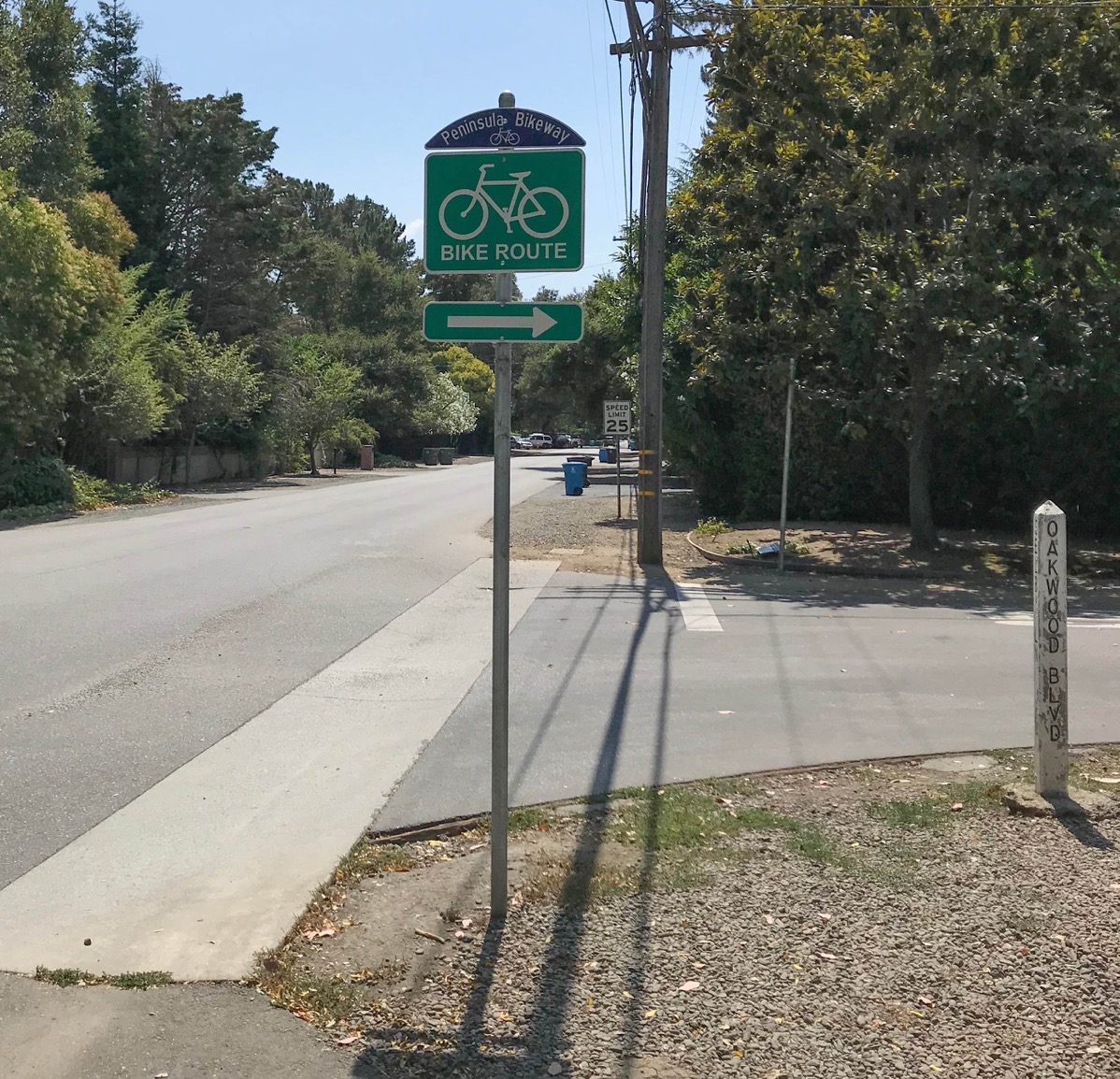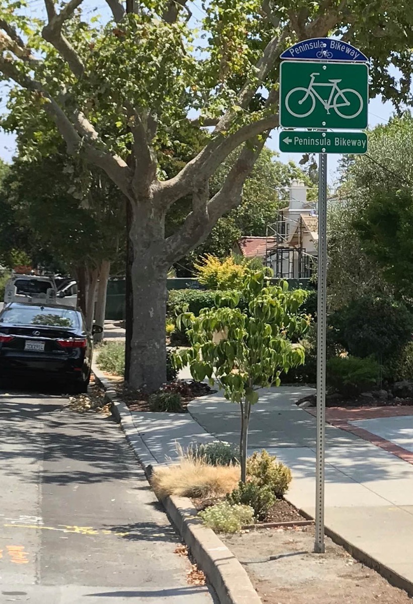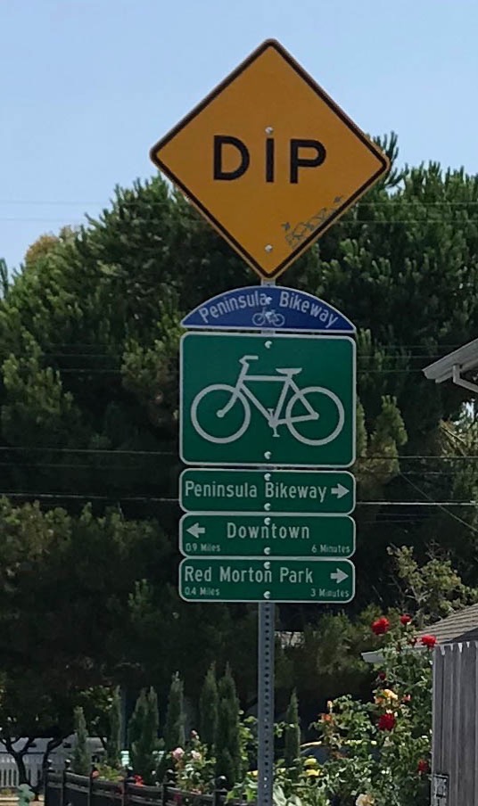 Cordilleras Creek serves as the boundary between Redwood City and San Carlos, and currently is the northern end of the Peninsula Bikeway. There isn’t yet a permanent sign marking the start of the bikeway, but head south on Warwick and you’ll see one between Edgewood Road and Arlington Road. Along the bikeway watch for signs with a blue “topper”: a dome-shaped blue sign with the image of a bike and the words “Peninsula Bikeway” (or just “Peninsula”) on top. They’re placed above official bikeway signs of course, but also atop many regular street signs, assuring the rider that they are on the correct route. Sometimes you need to look carefully to see the signs—the toppers are aligned in the direction of travel and don’t always face you—but whenever the path makes a change of direction, additional signs clearly indicate what you are to do. Significant points of interest that don’t lie along the bikeway—for instance, Redwood City’s Transit Center—are also called out by these “wayfinding” signs. And these signs helpfully include the distance to the named destination along with an estimate of the time needed to ride there.