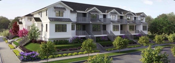The developer hopes to build two rows of five townhouses each, with a center driveway providing access to all ten garages. Four of the townhouses will face Vera Avenue, two will face Adams Street, and the remaining four will be accessed via a sidewalk that begins on Adams Street and runs the length of the property. Here is a rendering of what the developer anticipates that the final project will look like: