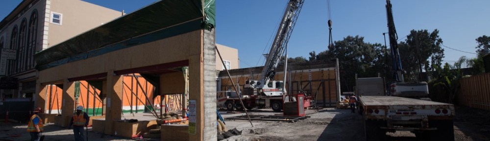 Fortunately, the big project currently underway at 851 Main Street should bring a rather nice-sized, high quality retail space to Main Street (previously there were a couple of somewhat tired-looking restaurants there). For that reason, and because the retail space will occupy the portion of the building that was deemed historic (and is therefore being preserved), I’ve been watching the building project with interest. All of the non-historic portions have been cleared away, and the historic storefront, back wall, and one side wall have been carefully preserved so as to not be damaged during construction.