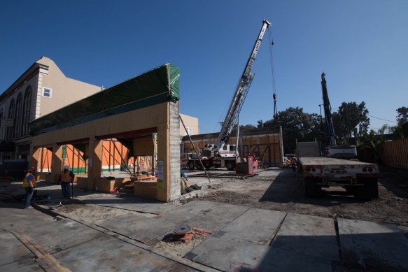 Shifting to the back wall, note the plywood being used to protect the wall’s surfaces and the steel frames being used to ensure that the wall remains intact during the construction process. It appears that the white crane is being used to help hold up the back wall: two cables appear to run from the crane to anchor points on the wall’s free end. I can imagine that without the building’s fourth wall, and without rafters connecting this back wall to the one in the front, the back wall could easily be knocked over. Thus the crane, I presume.