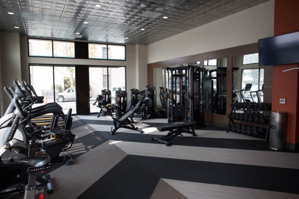 My tour was given by Amy Strand, one of Greystar’s property managers. We were accompanied by Troy Vernon and Jonathan Fearn, two of Greystar Development’s point people for projects such as this (I previously met both Troy and Jonathan at one of the workshops for Greystar’s proposed 1601 El Camino Real project). We began our tour by looking at the building’s ground-floor amenities. From the leasing center (which is on the corner of the building closest to where Greystar’s 1409 El Camino Real project is now well underway) we walked through the library, which is a cozy little room with comfy chairs and a couple of workstations. Next, we passed a wall of mailboxes before stepping into the well-equipped fitness center.