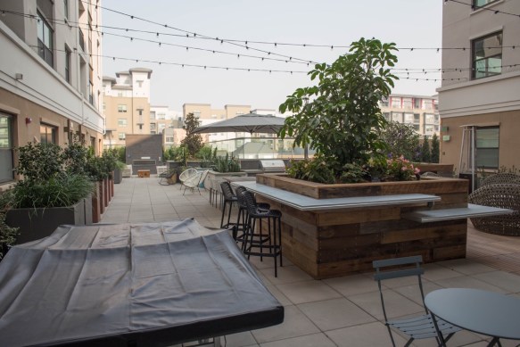 On the building’s “podium level,” which is the level immediately above the lobby, is the Resident Lounge and the building’s outdoor courtyard. Huxley is designed in a rough U-shape, with one leg shorter than the other. The courtyard is thus surrounded on three sides by the building but has a clear view out towards Franklin Street, and a partial view towards Diller Street. The courtyard itself is not terribly large, but is nicely appointed with places to sit, plus BBQs, a ping-pong table, and a large-screen TV. There is a nice little water feature, but I should note that this building has neither a pool nor a spa.