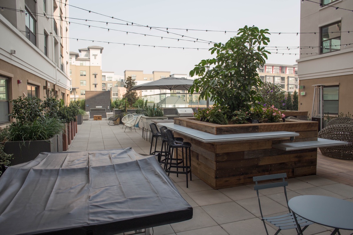 Huxley has an additional common area on the top floor, in the very center of the front facade: a medium-sized “rooftop” deck that faces Redwood City’s western hills. On that deck you’ll find seating and some great views (plus that complimentary WiFi, of course). There is no BBQ up there, so it is more of a hangout space and a place to get some great sunset views.