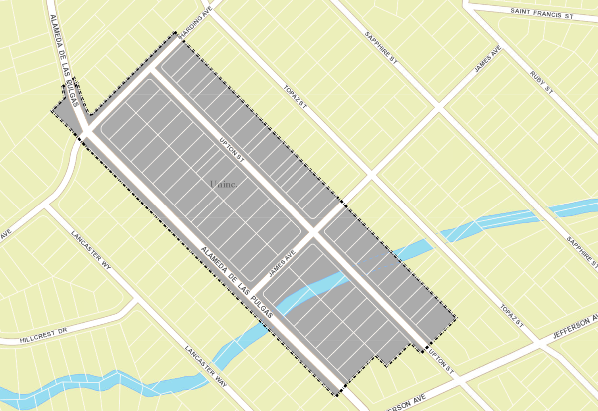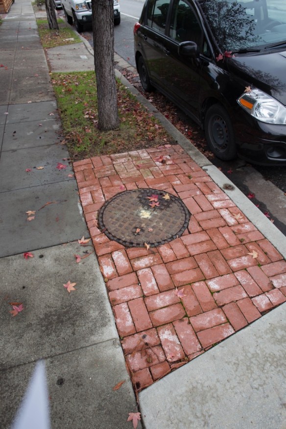 About the above picture: although that particular manhole cover is in the parking strip on the northeast side of Alameda de las Pulgas between James Avenue and Jefferson Avenue, it isn’t actually in Redwood City. Herein lies the Eagle Hill neighborhood’s one real oddity: for some reason there is a roughly two-and-a-half-block portion of unincorporated land here (this land is part of San Mateo County, but not part of the city). You wouldn’t know it from looking at it: there is nothing that visibly distinguishes the homes in the unincorporated section from the Redwood City homes that completely surround it. But this area, apparently known as Kensington Square, runs from the south side of Harding Avenue to just short of Jefferson Avenue (the homes along Jefferson are in Redwood City), and from the east side of Alameda de las Pulgas to Upton Street (both sides). The 72 properties in this rectangular area are part of San Mateo County, but not part of Redwood City. In case the above description didn’t work for you, here is a map, with the unincorporated properties colored gray and the surrounding Redwood City properties colored yellow:
