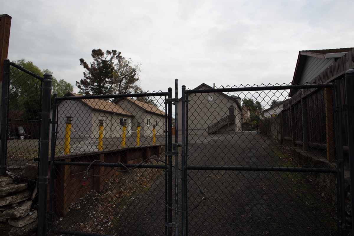Painted on the face of the building are the words “The Christadelphians”: this is the San Francisco Peninsula Christadelphian Ecclesia. From their website I learned that the Christadelphians are “a people united by a common belief in the original Christian Gospel, not by organizational structure.” They call their local organizations “ecclesias” to emphasize the fact that they see themselves as a community of believers, rather than a place where people meet. I am interested in the place itself, however, and this one, too, is interesting in that the property is narrow and quite deep, extending down the hill behind the church building all the way to the end of Inner Circle. If you go up that dead-end street, you’ll be confronted by gates, through which you can see the back side of the church building, a parking lot, and two smaller church buildings (possibly where the Sunday School is held):
