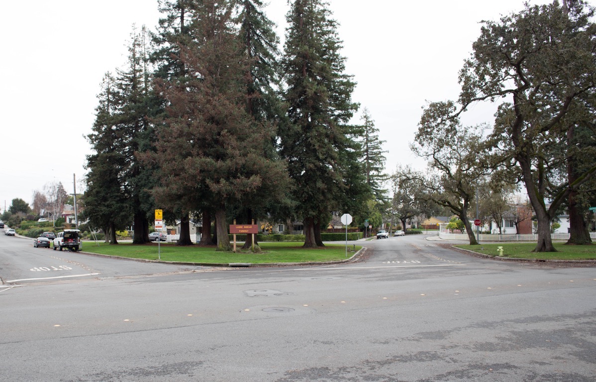 As I noted earlier the neighborhood has no significant parks, merely a couple of “parklets” — tiny bits of otherwise unusable land that are planted with lawns and trees and thus can be viewed as mini-parks. All of them are triangular, and apparently are bits of land that were left over when a couple of streets came together at odd angles. All are in the middle of those streets, meaning that you have to cross a street in order to get to them. You’ll find one at the corner of Alameda de las Pulgas and Hopkins Avenue, one where Quartz Street splits off from Avenue Del Ora (just up from John Gill, near Eagle Hill Terrace), a third where Brewster Avenue meets Hillview Avenue, and the last — and largest, and the only one with a picnic bench or two — where Brewster Ave meets Nevada Street. This final parklet is cleaved in two by Southgate Street, and I believe is also the only one to actually have a name: “Laurie Duncan Parkway.” Either the word “parkway” is misapplied here, or the sign is referring not to the park, but to an alternate name for one of the surrounding streets: the dictionary defines the word parkway as a landscaped highway, not a park. In any case, I did some digging and learned that Mr. Laurie Duncan (yes, he was a man) was born in Hollister but moved to Redwood City in 1919. He was in construction, and apparently built Redwood City’s first apartment house. Mr. Duncan served as Redwood City’s building inspector for some 15 years, and was a member of several fraternal organizations: the Masons, Kiwanis, and the Eagles. He died in 1938.