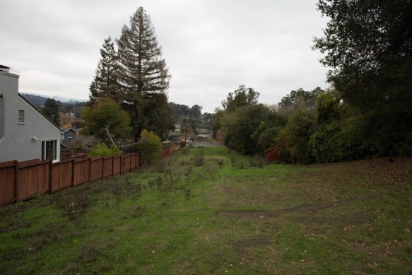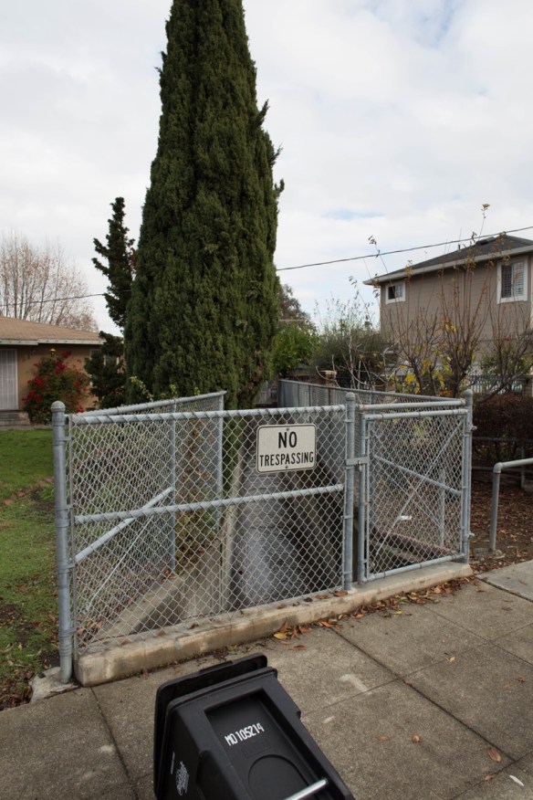 While I’m in this part of the neighborhood, I should next say a bit about the Hetch Hetchy right-of-way. Most of Redwood City’s drinking water comes from the Hetch Hetchy Reservoir, which is located just north of Yosemite National Park. A series of pipes bring that water across the state to our area. As you can see when you look at almost any map of Redwood City (including the one I began this blog post with), those pipes run underground in a mostly arrow-straight straight line cutting from southeast to northwest through Redwood City. The pipes first enter the Eagle Hill neighborhood next to John Gill Elementary, running up Avenue Del Ora from that street’s intersection with Jefferson Avenue. At South Place, Avenue Del Ora curves to the right, but the Hetch Hetchy pipes continue straight ahead. They cross Quartz Street, James Avenue, Harding Avenue, and Topaz Street before crossing Alameda de las Pulgas, which is where they leave the Eagle Hill neighborhood. Throughout most of the neighborhood the Hetch Hetchy right-of-way — which cannot have permanent structures built upon it, although there are some driveways, parking lots and yards above it — is clearly visible as a wide swath slicing between homes, mostly bounded by chain link or other fencing.