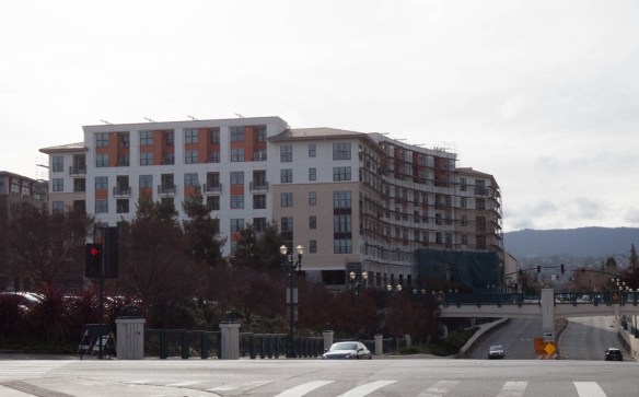 The Elan Redwood City project, at the corner of Jefferson Ave. and Franklin St., appears to finally be in its end stages. I hope to tour it when it is complete, and if I do I’ll have to ask why it took so long: this project broke ground well before Huxley, at 1305 El Camino Real, which has been leasing now for a couple of months. In any case, a great deal of the scaffolding is down on the Elan Redwood City building: