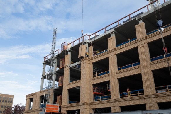 Heading down Jefferson Ave. I stopped and watched the contractors applying the exterior surface to the Broadway Station building, at the corner of Jefferson Ave. and Broadway. Although the building appears to be largely made of brick, in reality they are applying pre-cast concrete panels that have a brick-like tile pre-applied: