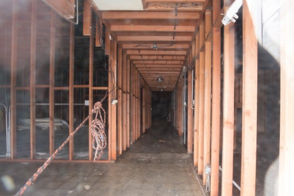 Because that plastic is pretty effective at keeping me from seeing inside, I headed around the back to see if I could see anything through the rear door. Fortunately, I could. Unfortunately, the limited view I was able to get didn’t show any new activity: the framing you see in the following picture was put up shortly after the Chinese restaurant closed, and I am not seeing any other visible progress.