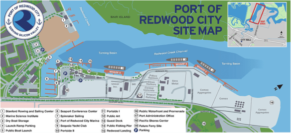 The port is some 120 acres in all, and because it is a working port, much of it is of course off-limits to the public. But immediately around the Port of Redwood City Marina (number 8 on the map) there are benches, grassy areas, and plenty of places where you can take a pleasant stroll. This is also where you’ll find Spinnaker Sailing (number 7 on the map), for those who are interested in learning how to sail.
