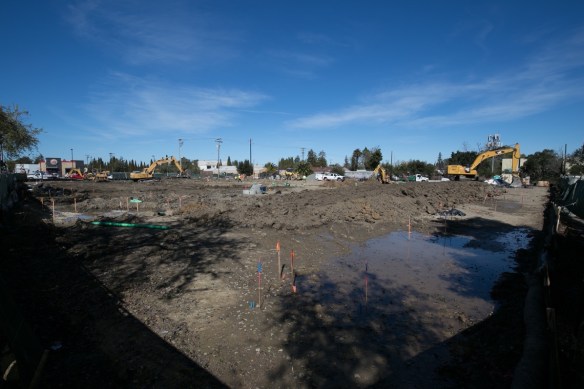 First up is the 33-unit townhouse project being built on the site formerly occupied by Honda Redwood City, at 601 El Camino Real. Flags have been placed to mark out various aspects of the five buildings that will make up this housing development, and various holes and trenches are in the process of being dug: