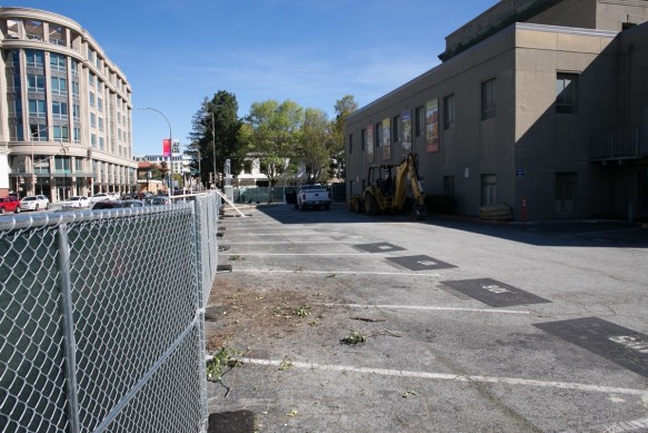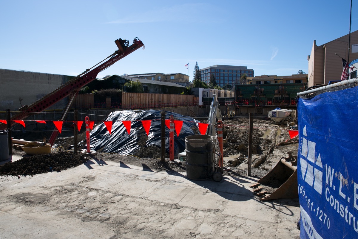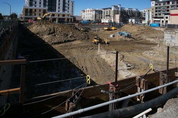 Head down El Camino Real past Jefferson and you come to 1409 El Camino Real, the site of the so-called “Greystar IV” project. This 350-unit apartment building will end up being eight stories tall, but for now the construction crews are focused on digging the giant hole for the three-level underground garage: