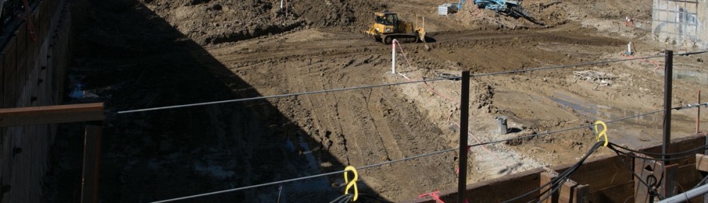 If it isn’t clear from the above picture, this hole is very large, and very deep. They’re hauling a great deal of dirt from the site, and of course shoring up the sides of the hole as they go. I find this phase of the building process to be especially fascinating; I can’t seem to get enough of watching backhoes chewing into the earth.