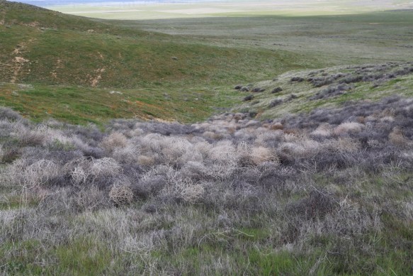 Our first stop was in a place I’d never heard of before: the Antelope Valley California Poppy Preserve State Natural Reserve, which is just west of Lancaster, CA. Although we were about two or three weeks too early to really catch the poppies in bloom, we paid the entry fee (a reasonable $10) and went in anyway. We ended up having a really nice hike on the trails throughout the 1,745-acre Natural Reserve, and saw plenty of poppies — although these were individual early blooms. We were told that if we came back in a couple of weeks the hillsides would be covered with the bright orange flowers, but I’m afraid we’ll have to miss that sight this year. (California poppies can be red, orange, yellow, and even pink; the ones we saw were pretty much all orange.) We did see a number of other interesting wildflowers, plus some birds, and a whole host of not-yet-dried tumbleweeds. The tumbleweeds were all bunched up, trapped at the head of a couple of small valleys. And their undried (or partially dried) colors — a host of blues and grays — were a beautiful contrast against the green grasses and other small plants: