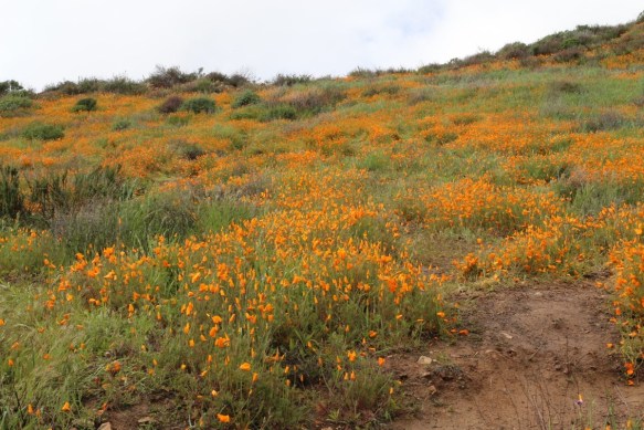 The next day we stopped in at Lake Elsinore (on Interstate 15, due south of Riverside) where we had better luck. Although it was a cold, somewhat rainy day, and thus the poppies hadn’t fully opened when we were there, they looked pretty impressive nevertheless. These poppies are located within a Riverside County Wildlife Conservation Area (just to the east of I-15, at Lake Street, if you want to visit); no entrance is required. In fact, you could just drive by on the freeway and admire them. But to get the best views, you’ll want to pull off the freeway and take a walk up the dirt (muddy, in our case) road that winds up the hills and through the fields. I’m guessing that in another week or two these fields will be truly impressive, but we were happy enough with what we saw.