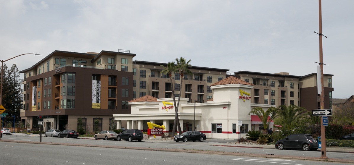 Encore Redwood City, the six-story, 90-unit apartment building (7 of which are affordable) at 849 Veterans Blvd. is essentially complete and is now leasing. Apartments start at $3,300 for a one-bedroom, 1-bathroom, 674-square-foot apartment. They go all the way up to more than $5,600 for a 1,436 square-foot unit with three bedrooms and two bathrooms.