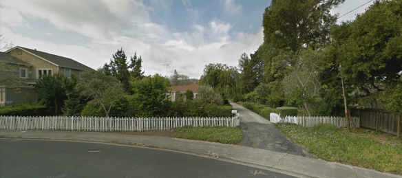 In this case the original house (with the dark roof, just below the open field) appears to be a medium-sized one. There also appears to have been an outbuilding or two, and I note that the property had driveway access to both Canyon Road and Bain Place. But as anyone who owns a single-family home on the San Francisco Peninsula knows, the vast majority of their home’s value is not in the house, but in the land. And a parcel as large as this one had to be incredibly valuable. Thus, it was divided it into four parcels and four houses of varying sizes (from large to very large) were built on the land. Due to the shape of the property, three of the houses face onto Bain Place, while the fourth faces Canyon Road. This one is located at the corner, and at 4,000 square feet, is one of the largest: