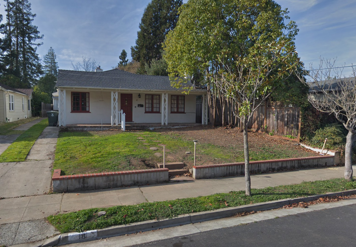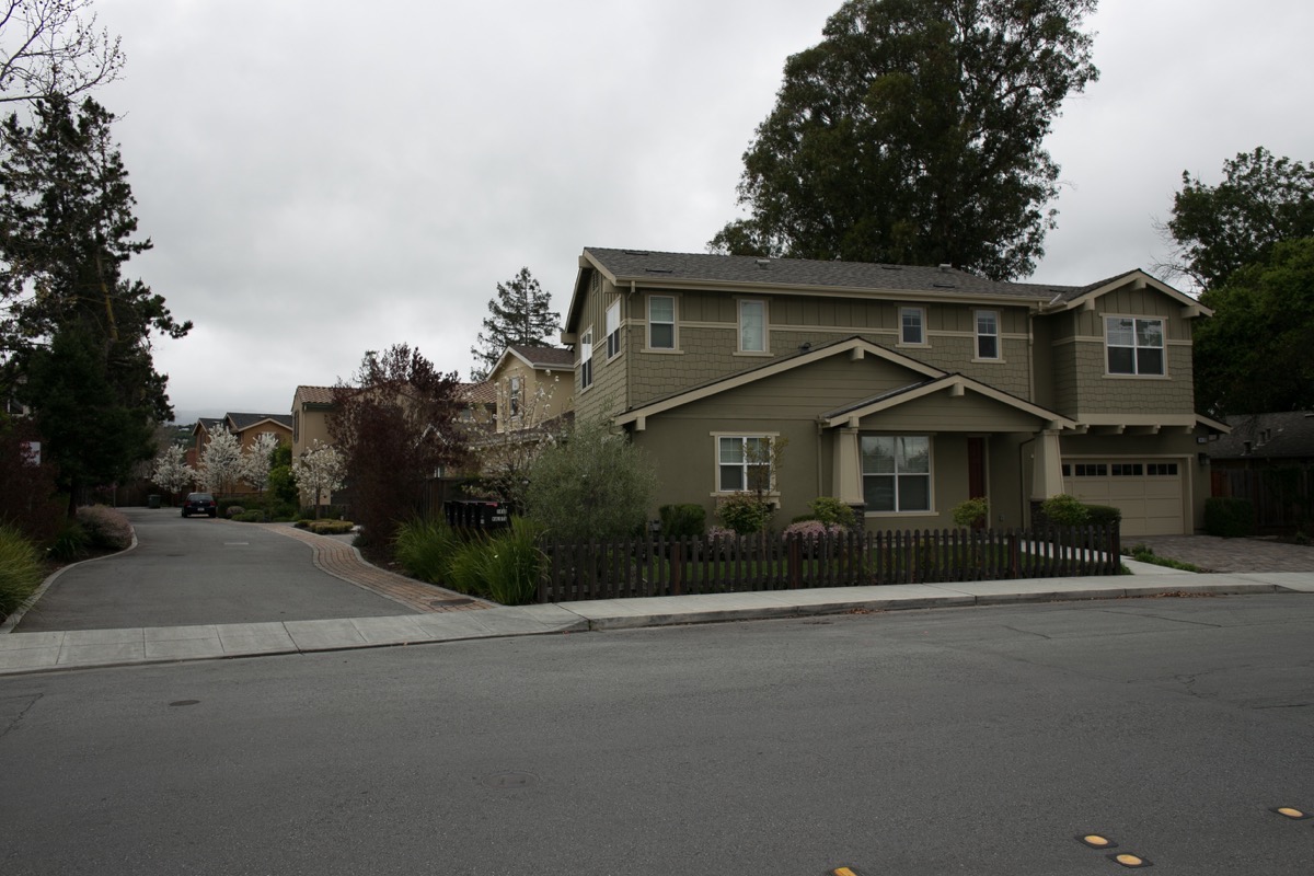 In this case the original house (with the dark roof, just below the open field) appears to be a medium-sized one. There also appears to have been an outbuilding or two, and I note that the property had driveway access to both Canyon Road and Bain Place. But as anyone who owns a single-family home on the San Francisco Peninsula knows, the vast majority of their home’s value is not in the house, but in the land. And a parcel as large as this one had to be incredibly valuable. Thus, it was divided it into four parcels and four houses of varying sizes (from large to very large) were built on the land. Due to the shape of the property, three of the houses face onto Bain Place, while the fourth faces Canyon Road. This one is located at the corner, and at 4,000 square feet, is one of the largest: