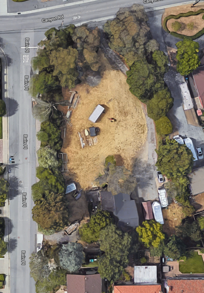 The above project was completed in 2014. More recently, a developer did something similar with yet another large lot that again contained one single-family home, at the corner of Canyon Road and Bain Place. Prior to the new development that particular property was always hard for me to photograph, since the homeowner had lined the perimeter of the property with trees and bushes that over the years had grown into a very effective privacy fence. Technology almost always has a way, however, so thanks to Google Earth and its satellite-mounted cameras we can see just what that property used to look like when viewed from overhead: