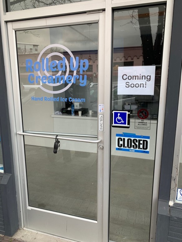 First up is one I’ve been watching seemingly forever, the ice cream shop slated for the tiny retail space at 2621 Broadway, in front of the offices of the tech company Avast and across Broadway from City Pub. Back in July 2016 this space had its windows papered over, indicating that something may have been going on inside. By September 2017 I had received reliable information that it was being fitted out as an ice cream shop. I assumed that turning a brand new space into an ice cream shop wouldn’t take long, but I was quite wrong. For the past 19 months work has been going on inside the space, in fits and starts. Finally, though, it appears that we are on the cusp of actually being able to buy ice cream at the newly christened Rolled Up Creamery. Once I knew the name I did a bit of internet research and learned that a business with that name had been operating in San Francisco, but according to Yelp that location has closed. According to the sign on our location’s door, however, ours is about to open.