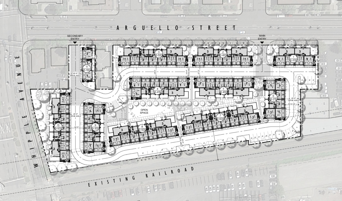 [Click the above for a version you can zoom in on] Arguello Street runs across the top of the above image, and the Caltrain tracks angle across the bottom. Whipple Avenue is to the left.