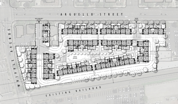 This week’s proposal is for another good-sized housing development, one that would be located in an interesting place. With some exceptions, this project is proposed for the entire property between Arguello Street and the Caltrain tracks, from Whipple Avenue to just shy of Hopkins Avenue. The largest existing portion of the property is currently occupied by A-1 Rental Center, but the development encompasses a couple of additional parcels as well. As for which parcels in that area are not included, count the two beautiful old houses — which are actually being used as offices — that you’ve undoubtedly noticed at the corner of Whipple Avenue and Arguello Street. As well, between the Arguello Street driveway into A-1 and the ivy-covered A-1 Rental Center building itself is tucked a house that is also slated to remain: