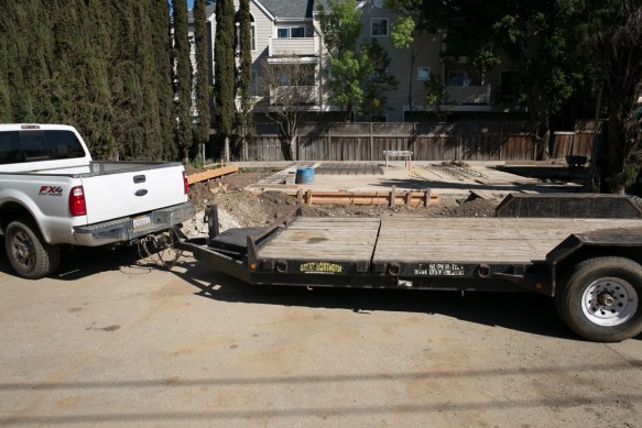 Although the building’s main structure remains, all of the stucco siding has been removed and the interior has been completely stripped bare. I was surprised and somewhat pleased to note that work on the building hasn’t completely stopped, however — although given the length of time it has taken to the building to this point, it clearly had stalled for some time. But when I was there I noticed someone puttering around the site, and I happened to drive by the following day and observed a pair of men tugging at a last bit of old stucco from the side of the building. Thus, although I don’t yet know what the plans are for this site — beyond that bright orange “For Lease” sign (which notes “Dental/Medical Permitted”) — it does appear that the building’s footprint is being enlarged, as evidenced by some work that appears to be underway to augment the concrete slab that makes up the building’s foundation: