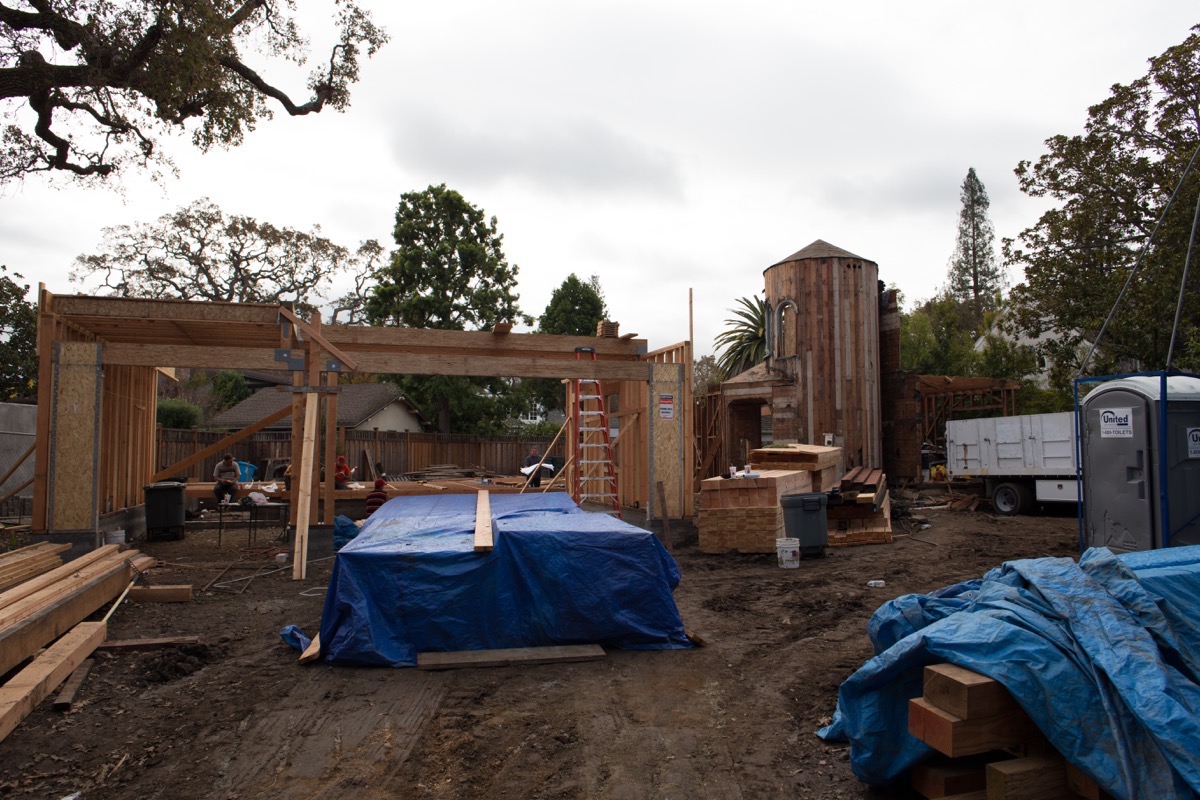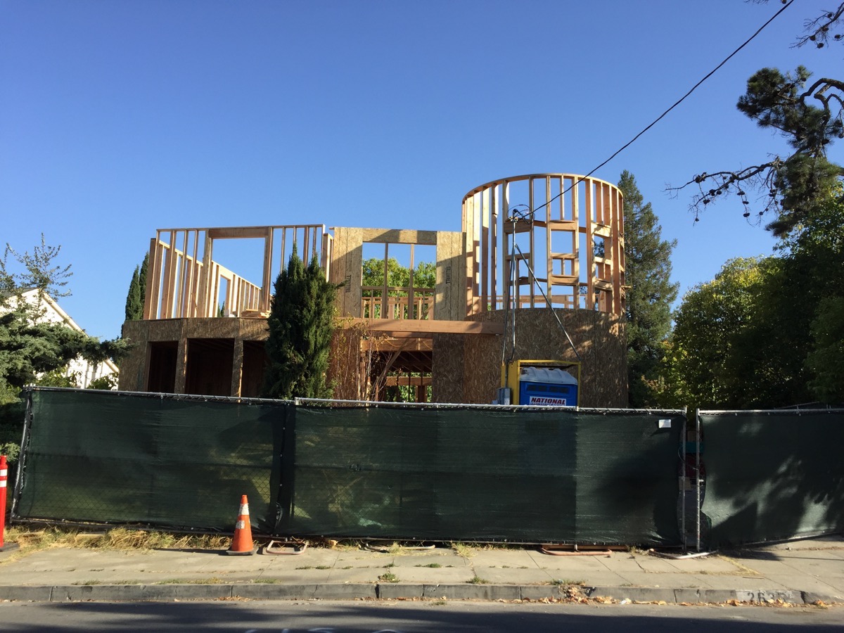 When this project was undertaken, the house that previously stood on this spot was almost completely torn down. The one element that they preserved from the original house, along with the framing that defined the front entrance, was that tower. Here is a picture that I took shortly after demolition was complete (and the garage framing had been started; as you can probably tell, that part is new):