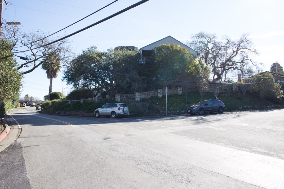 These three homes look somewhat castle-like, and certainly catch the eye. However, no enumeration of Redwood City’s “castle” homes would be complete without the magnificent one up in Emerald Hills, which sits at the corner of Highland Avenue and Laurel Way. From the intersection you only get a hint of what is to come, since the most interesting architectural feature of this house (a tower!) is largely hidden by a large tree: