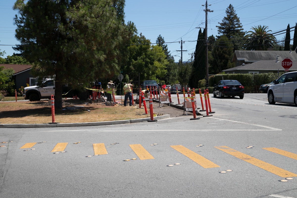 Many of the elements of the traffic calming project are actually somewhat small. The biggest component is to be found at the corner of Hopkins Avenue and Alameda de Las Pulgas, and that is what got underway this week: