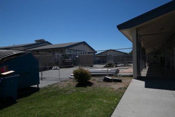 To the east of these six blocks is one of the centerpieces of the Redwood Village neighborhood: Hoover Community School and Hoover Park (including the Boys and Girls Club of the Peninsula building). Hoover School is one of the Redwood City School District’s larger campuses, boasting some 750 students in grades K-8. When I was there school was not in session, and the school seems to be taking advantage of that fact: they appeared to be doing some heavy maintenance.