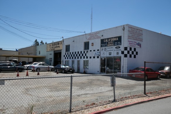 Even though the three similarly sized buildings all abut one another, only the one with the checkerboard strip across it is in the city of Redwood City. The radiator repair (“& Air Conditioning”!) business that sits up against it is in North Fair Oaks. As best I can tell, the Redwood City border runs right between these two businesses.