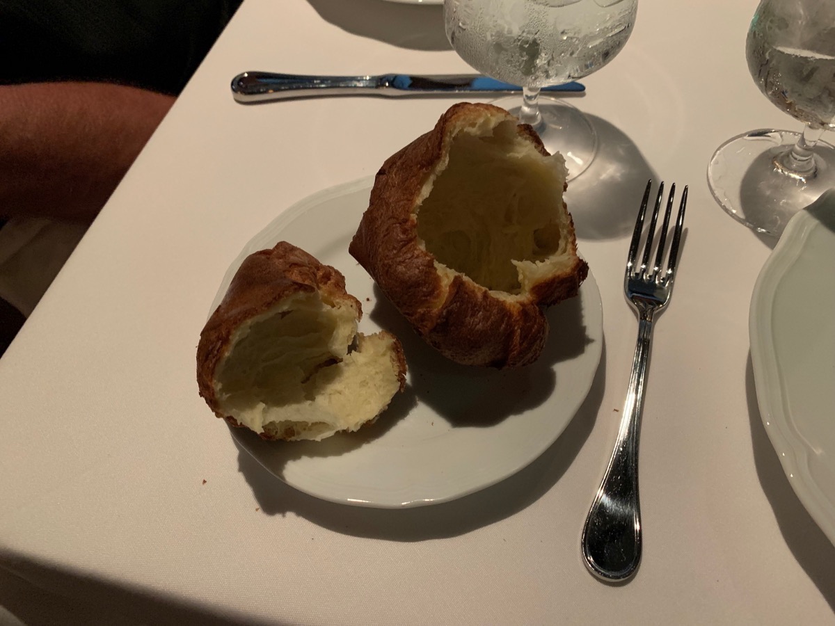 As for our meal itself, well, both the food and the service were excellent. Both I and one of my companions enjoyed Selby’s Veal Chop Marsala ($58), while my wife gushed over her Ratatouille Pithivier ($34) and my final companion had some sort of prawn special. Entree’s are à la carte, so together we shared a Carpaccio Cipriani appetizer ($22) and a side of Wild Mushrooms en Papillote ($21). Everything was wonderful, and we only wished that we had left room for dessert. Unfortunately, though, we didn’t: those veal chops, in particular, were large. But everything was cooked to perfection, and we had a most delightful meal. Oh, and did I mention the popovers? Rather than serving bread or rolls before the meal, as most restaurants do, Selby’s brings out a plate of giant, freshly baked popovers, one for each diner. Don’t let their size fool you: they are almost entirely hollow inside. And oh boy, are they good…