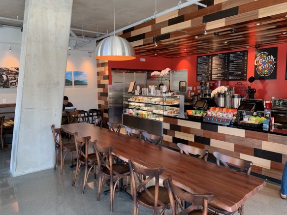 Coupa Café has done a great job with the interior decor, filling it with individual tables, long communal tables, and even a couple of couches. And for those of us who like dining alfresco, there are outside tables as well. I dropped in while on one of my afternoon walks, and saw a number of people on laptops; there are ample outlets and (apparently; I neglected to test it) Wi-Fi, so for those of you who like to work remotely, do check this place out.