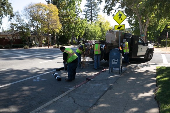 The Hopkins Avenue Traffic Calming (Pilot) Project is well underway. After reworking the intersection of Hopkins Avenue and Alameda de las Pulgas and then re-striping Hopkins Avenue, workers have been making their way down towards El Camino Real, installing rubber bumpers that, once the pilot has proven out, are to be replaced by concrete. The workers first installed the bumpers around the proposed center-lane islands, and included a number of plastic posts to increase their visibility: