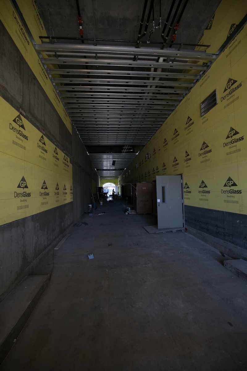 Clearly I was on the right track! I followed the arrows, which led me to a rather nondescript door in the north wall of the parking garage. This door led me into the tunnel that will eventually run from the alley to Walnut Street. Whether or not this tunnel will be fully open to the public when the building is complete is not clear to me; the retail spaces all have back doors that open into this tunnel, and it is possible that this will be for their exclusive use, so that they can bring in goods and take out trash and such. It is a good-sized tunnel, though, and the plans show the floor as being some sort of brick or tile, so perhaps it will indeed be usable by the public. On this particular outing I didn’t take a picture of the tunnel, but here is a photo of it that I took back in March: