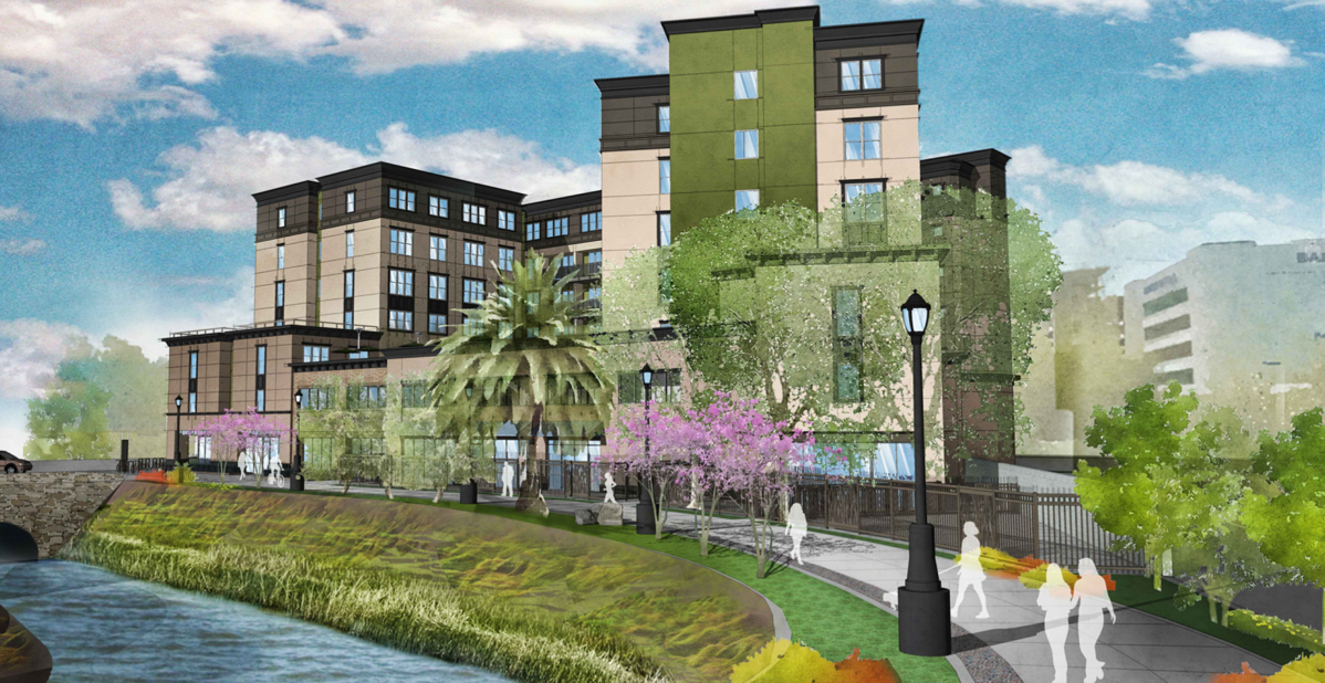 Arroyo Green will be a seven-story apartment building with an internal parking garage and, on the ground floor, a preschool. The preschool will face the creek, as will many of the apartments. Along the creek itself, between the creek and the building, there will be a park of sorts whose primary feature will be a section of the “Redwood Creek Trail.” All told the building will have 117 apartments (a mix of studios, one-bedroom, and two-bedroom units), all of which will be for low-income seniors at the Very Low and Extremely Low income levels. Most of the apartments—99 of them, in fact—will be reserved for people receiving voucher assistance. In addition to their apartments and the building’s garage, residents will have access to a community space, a workout room, a computer room, a game room, and a library/reading room. On the third floor residents will be able to enjoy a lovely outdoor plaza with planters, benches, and a gas grill. The project plans also show a Bocce court, and a portion of the plaza covered with artificial turf. This plaza, which is up near the top of the palm tree in the rendering, should provide residents with a nice view of the creek, and thus should be a pleasant place to relax on a sunny afternoon.