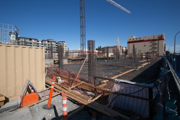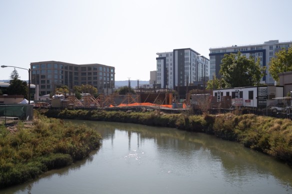 Because I couldn’t enter the property I had to settle for taking the picture from the Main Street bridge across Redwood Creek. But you can see that the walls and posts that will make up the ground floor — which will consist of the building’s lobby, the preschool, and the lower level of the two-story parking garage (which will be entirely above ground) — are either in place or have been formed and are ready to be poured.