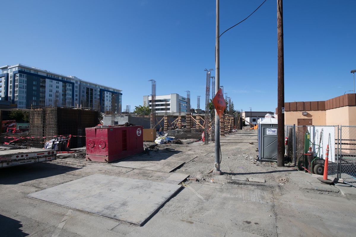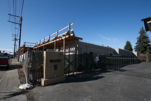 If you aren’t clear on where this building is located, you’ll find it on the east side of El Camino Real, just a little bit south of Dumbarton Avenue. Between Dumbarton Avenue and this building is the now-closed “Eco Green Auto Clean” car wash, which the builders of this project are using as a staging area.