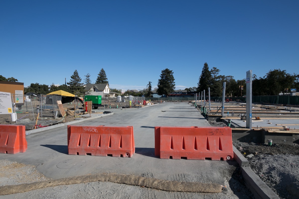 This particular photograph was taken from what will be the only vehicular entrance and exit from the project; I’m standing on Hopkins Avenue with Burger King behind me, and El Camino Real just out of the frame to the right. Those vertical slabs towards the right side of the image are steel supports that will help frame the garage doors. That row of units where you see those metal slabs is actually the set of units shown in the rendering, although here would be the backsides of those units.
