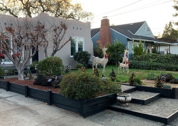 Elsewhere I saw entire blocks where there were almost no decorations. At least the age of the “inflatables” is mostly gone: there was a time just a couple of years ago when giant inflatable decorations seemed to be all the rage, and could be seen in the yards or on the rooftops of quite a few Redwood City homes. Remember the giant inflatable “snow globes”? With their blowing “snow” and other animations? I didn’t see any of those this year (there probably were a few somewhere, but I didn’t see them). I did run across a small number of homes with more tasteful inflatables, such as these: