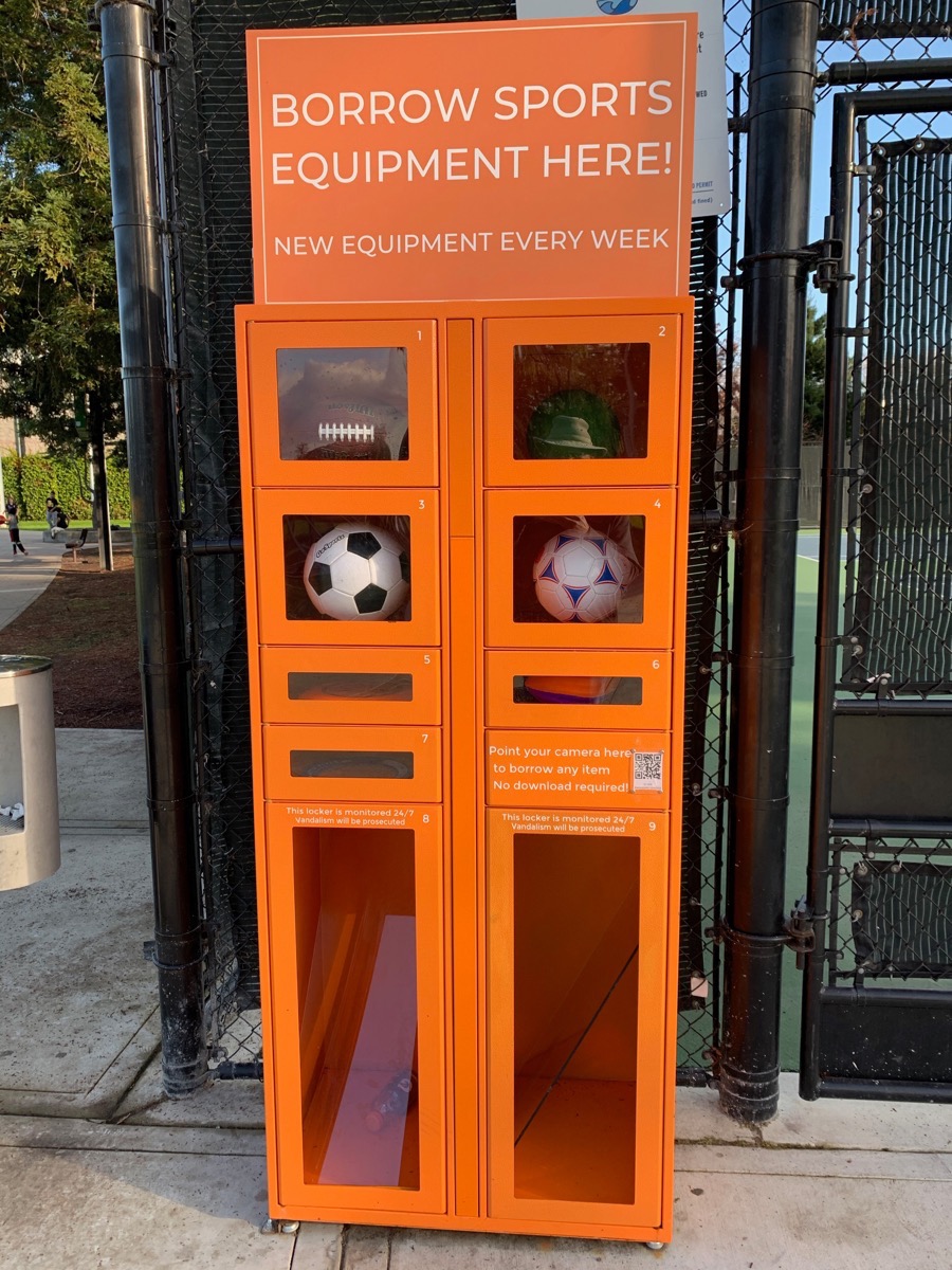 As you can probably see, this is a vending machine for sports equipment, one that allows you to borrow (but not buy) equipment for use at the park. Using your smartphone you scan the QR code printed on the face of the machine. It causes your browser to open to a website specific for this machine that knows what is in each compartment and allows you to select the ball or frisbee or whatever that you want to borrow. If you return the item within five minutes there is no charge. Otherwise, you pay the rate indicated on the website. A soccer ball or football currently runs $3 per hour, while a frisbee or a kickball will only set you back $2 per hour.
